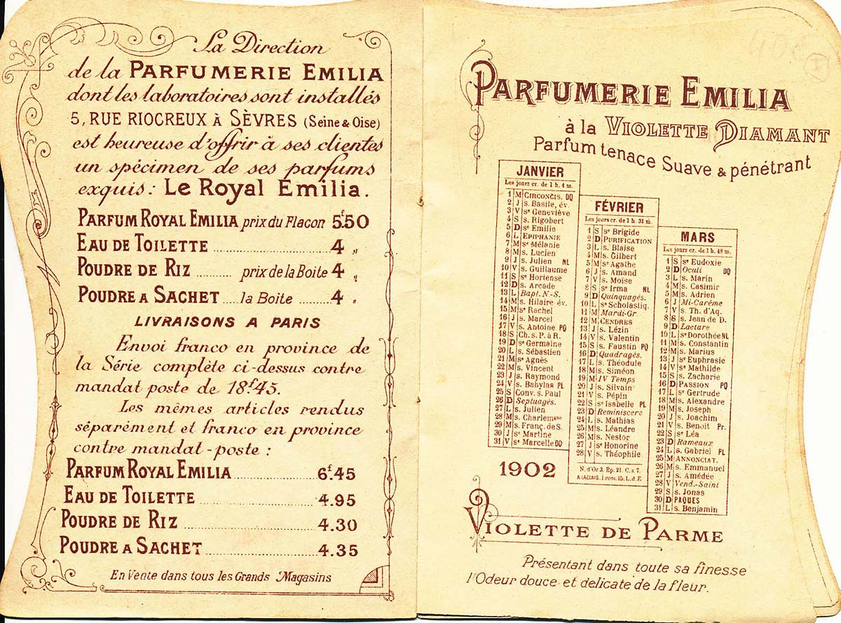 | Parfumerie Emilia 5 rue Riocreux, usine à Sèvres. 1902 |