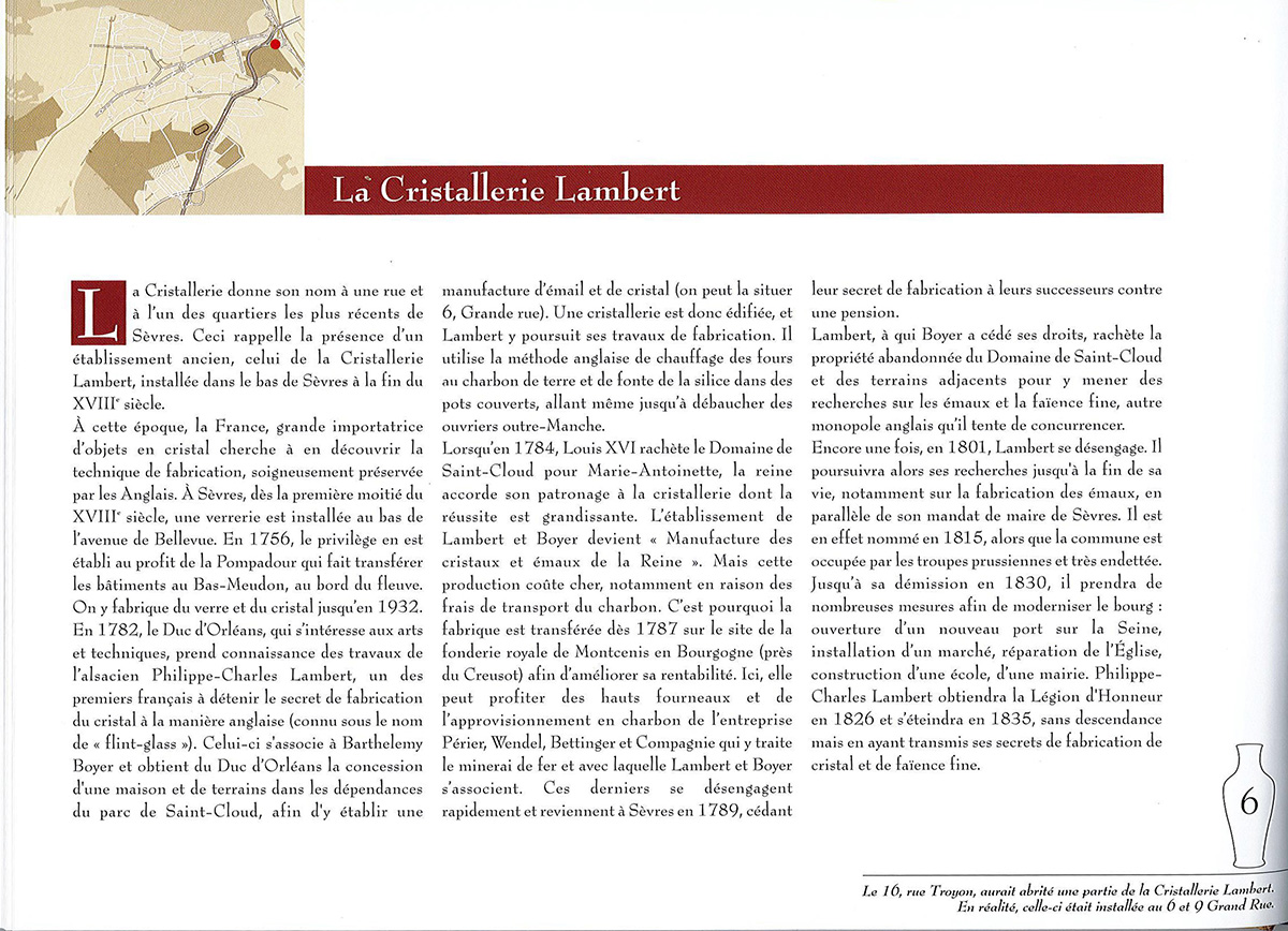 1782 : Philippe-Charles Lambert, faïencier alsacien, et Barthélemy Boyer, originaire d’Autun, s’associent pour créer une cristallerie à Sèvres dans les dépendances du parc de Saint-Cloud alors propriété du duc d’Orléans.